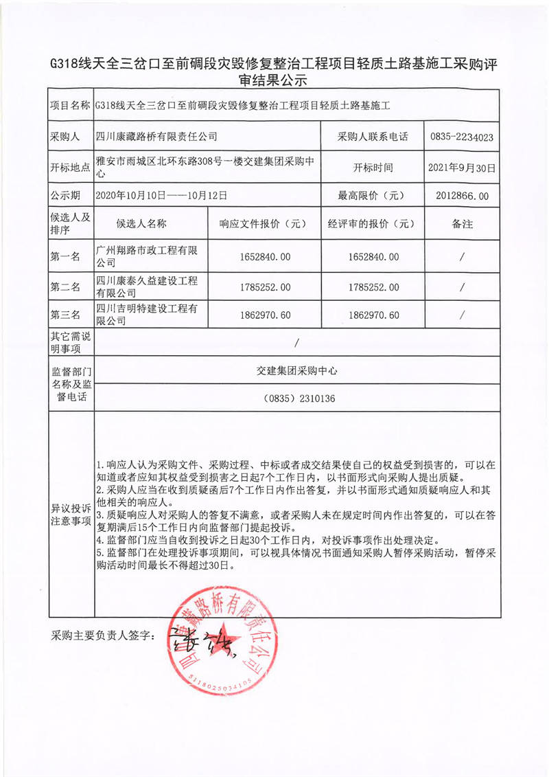 四川康藏路橋有限責任公司G318線天全三岔口至前碉段災毀修復整治工程項目輕質(zhì)土路基施工采購評審結果公示