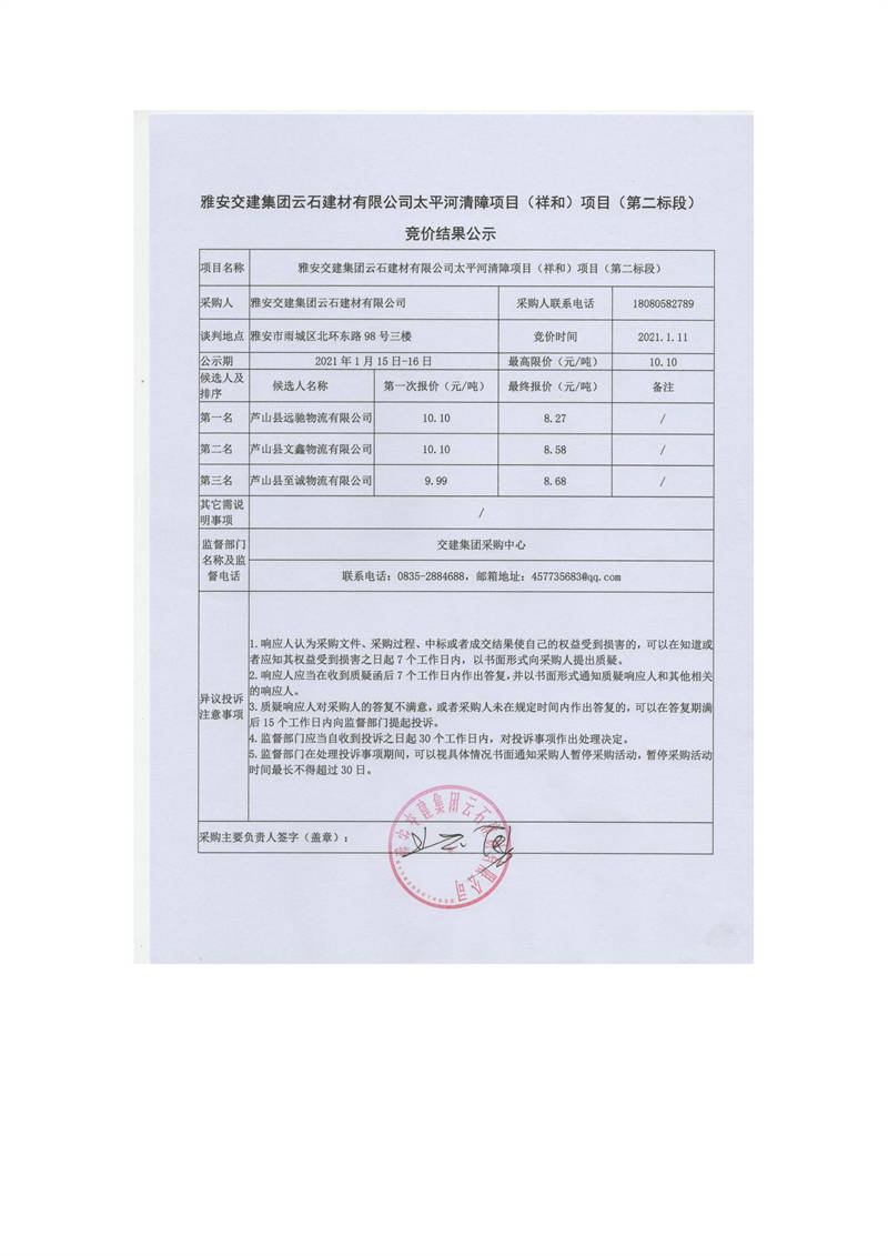 雅安交建集團(tuán)云石建材有限公司太平河清障項(xiàng)目(祥和)項(xiàng)目(第二標(biāo)段)競(jìng)價(jià)結(jié)果公示