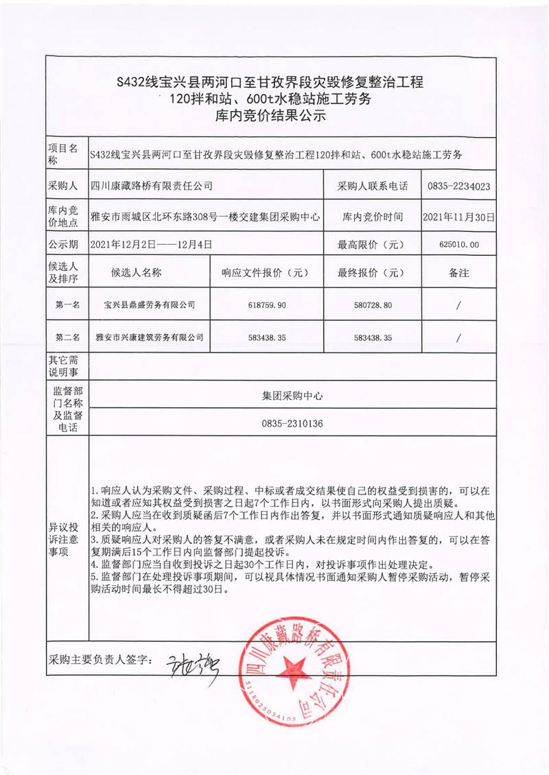 四川康藏路橋有限責任公司S432線寶興縣兩河口至甘孜界段災毀修復整治工程120拌和站、600t水穩(wěn)站施工勞務庫內競價結果公示