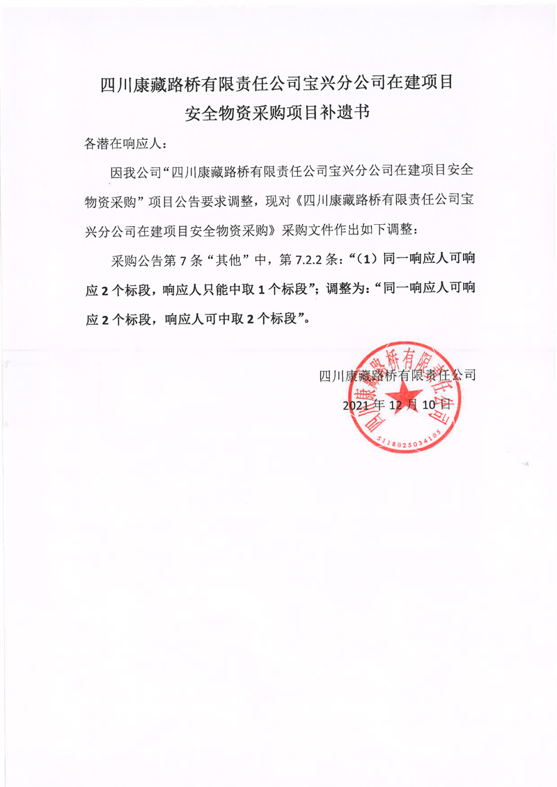 四川康藏路橋有限責(zé)任公司寶興分公司在建項目安全物資采購項目補遺書