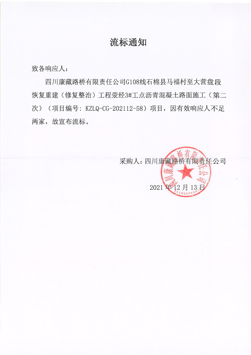 四川康藏路橋有限責(zé)任公司G108線石棉縣馬福村至大營盤段恢復(fù)重建(修復(fù)整治)工程滎經(jīng)3#工點瀝青混凝土路面施工(第二次)流標通知