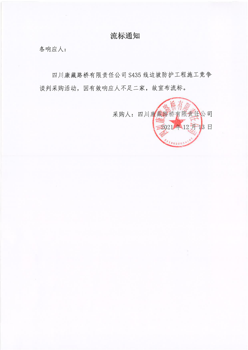 四川康藏路橋有限責(zé)任公司S435線邊坡防護工程施工采購流標(biāo)通知