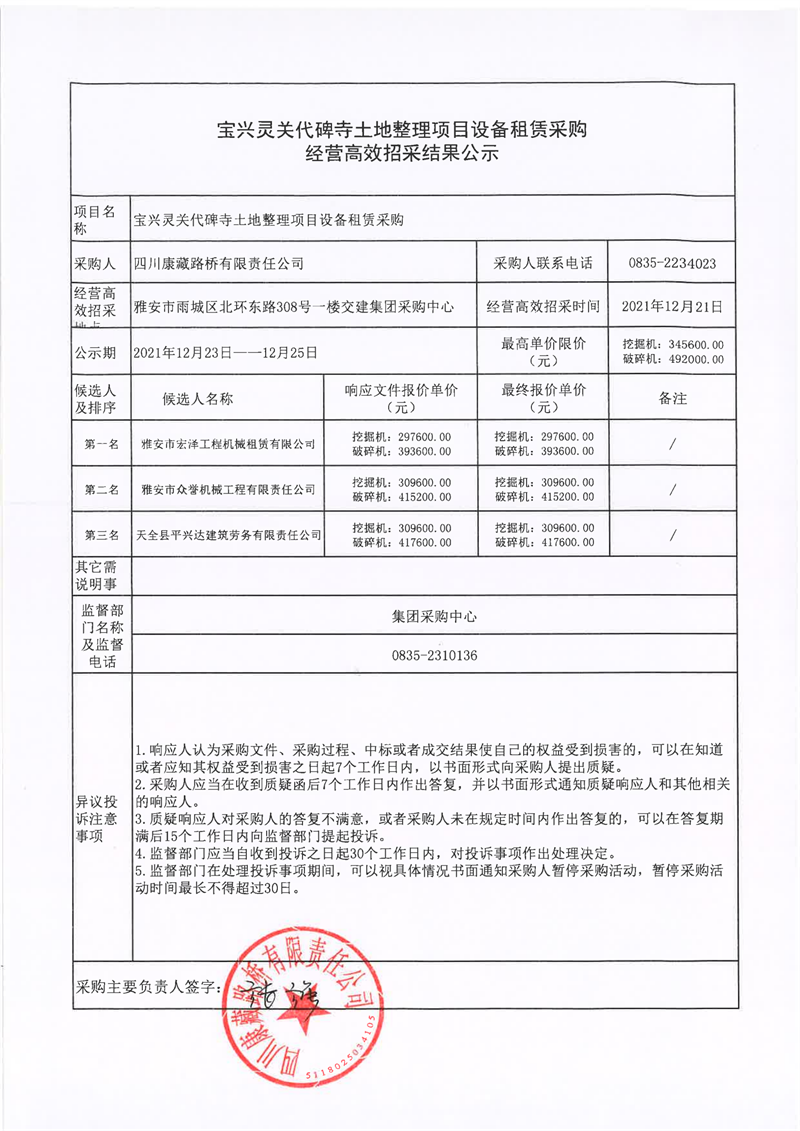 四川康藏路橋有限責任公司寶興靈關(guān)代碑寺土地整理項目設備租賃采購經(jīng)營高效招采結(jié)果公示
