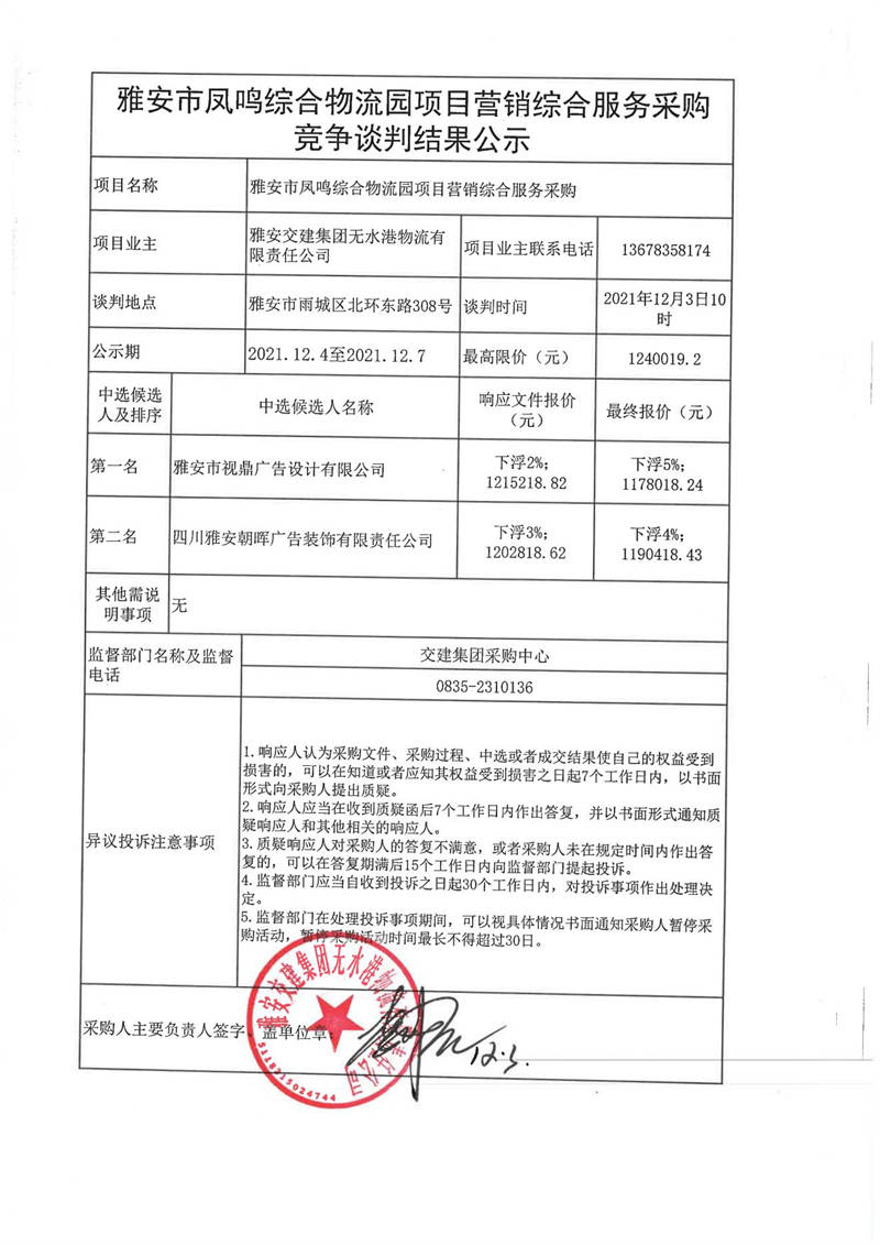 雅安交建集團(tuán)無水港物流有限責(zé)任公司雅安市鳳鳴綜合物流園項(xiàng)目營(yíng)銷綜合服務(wù)采購(gòu)競(jìng)爭(zhēng)談判結(jié)果公示