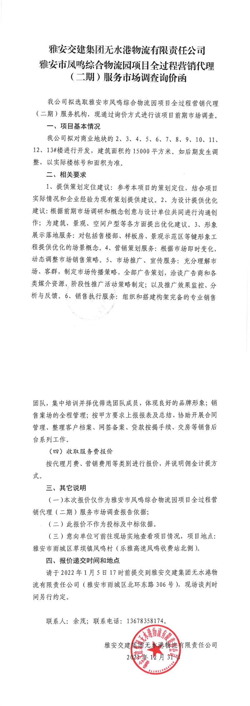 雅安交建集團(tuán)無(wú)水港物流有限責(zé)任公司雅安市鳳鳴綜合物流園項(xiàng)目全過(guò)程營(yíng)銷(xiāo)代理(二期)服務(wù)市場(chǎng)調(diào)查詢(xún)價(jià)函