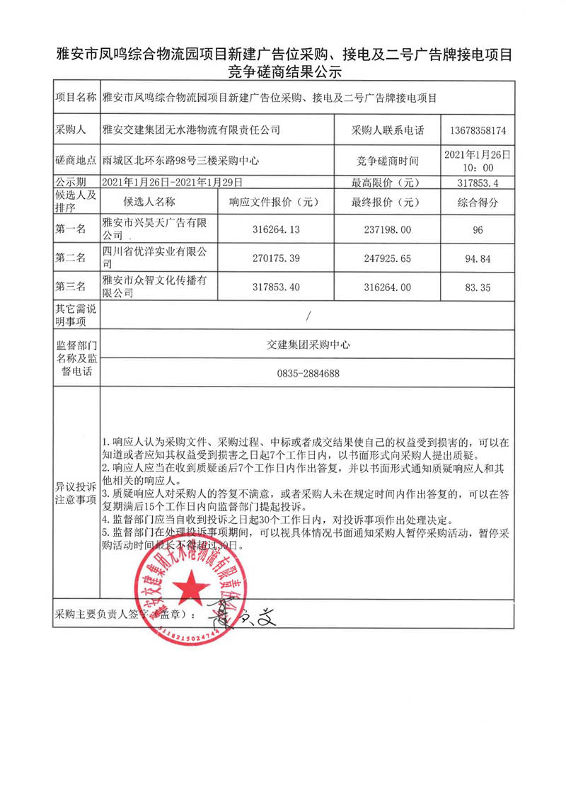 雅安交建集團(tuán)無水港物流有限責(zé)任公司雅安市鳳鳴綜合物流園項(xiàng)目新建廣告位采購、接電及二號(hào)廣告牌接電項(xiàng)目競爭磋商結(jié)果公示