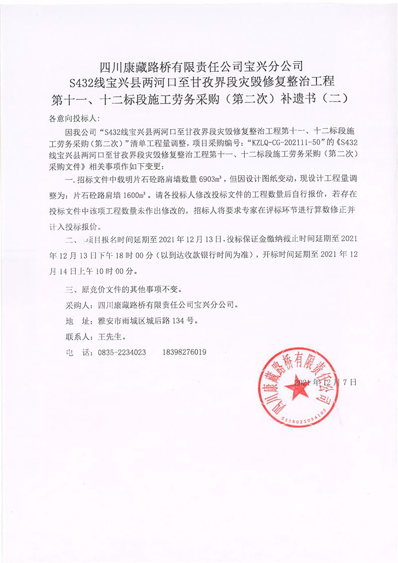 四川康藏路橋有限責(zé)任公司寶興分公司S432線寶興縣兩河口至甘孜界段災(zāi)毀修復(fù)整治工程第十一、十二標(biāo)段施工勞務(wù)采購(gòu)(第二次)補(bǔ)遺書(二)