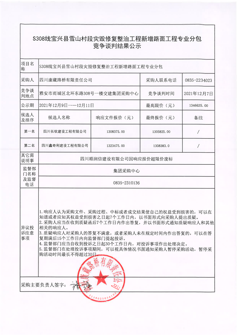 四川康藏路橋有限責任公司S308線寶興縣雪山村段災毀修復整治工程新增路面工程專業(yè)分包競爭談判結果公示