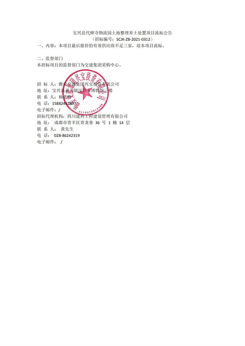 雅安交建集團興寶投資有限公司寶興縣代碑寺物流園土地整理棄土處置項目流標公告