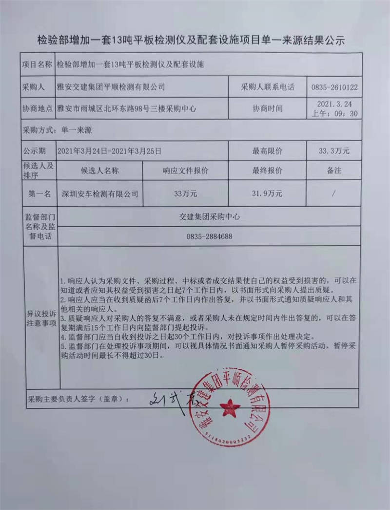 雅安交建集團(tuán)平順檢測(cè)有限公司檢驗(yàn)部增加一套13噸平板檢測(cè)儀及配套設(shè)施項(xiàng)目單一來源結(jié)果公示