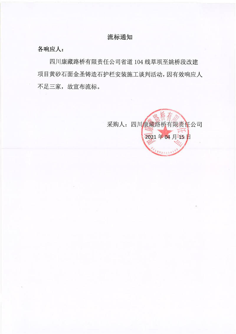 四川康藏路橋有限責(zé)任公司省道104線草壩至姚橋段改建項(xiàng)目黃砂石面金圣鑄造石護(hù)欄安裝施工流標(biāo)通知
