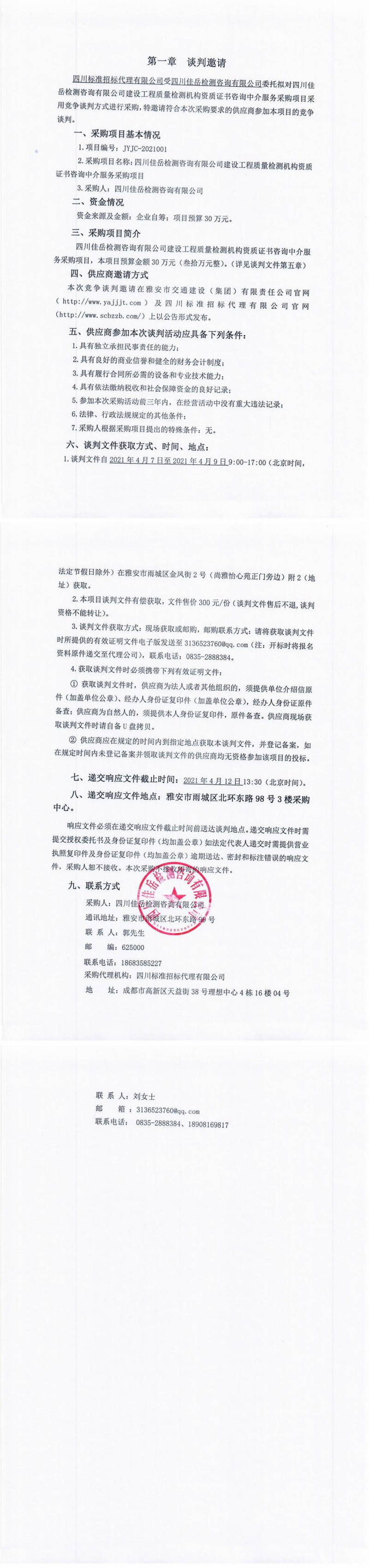 四川佳岳檢測咨詢有限公司建設(shè)工程質(zhì)量檢測機(jī)構(gòu)資質(zhì)證書咨詢中介服務(wù)采購項目競爭談判公告