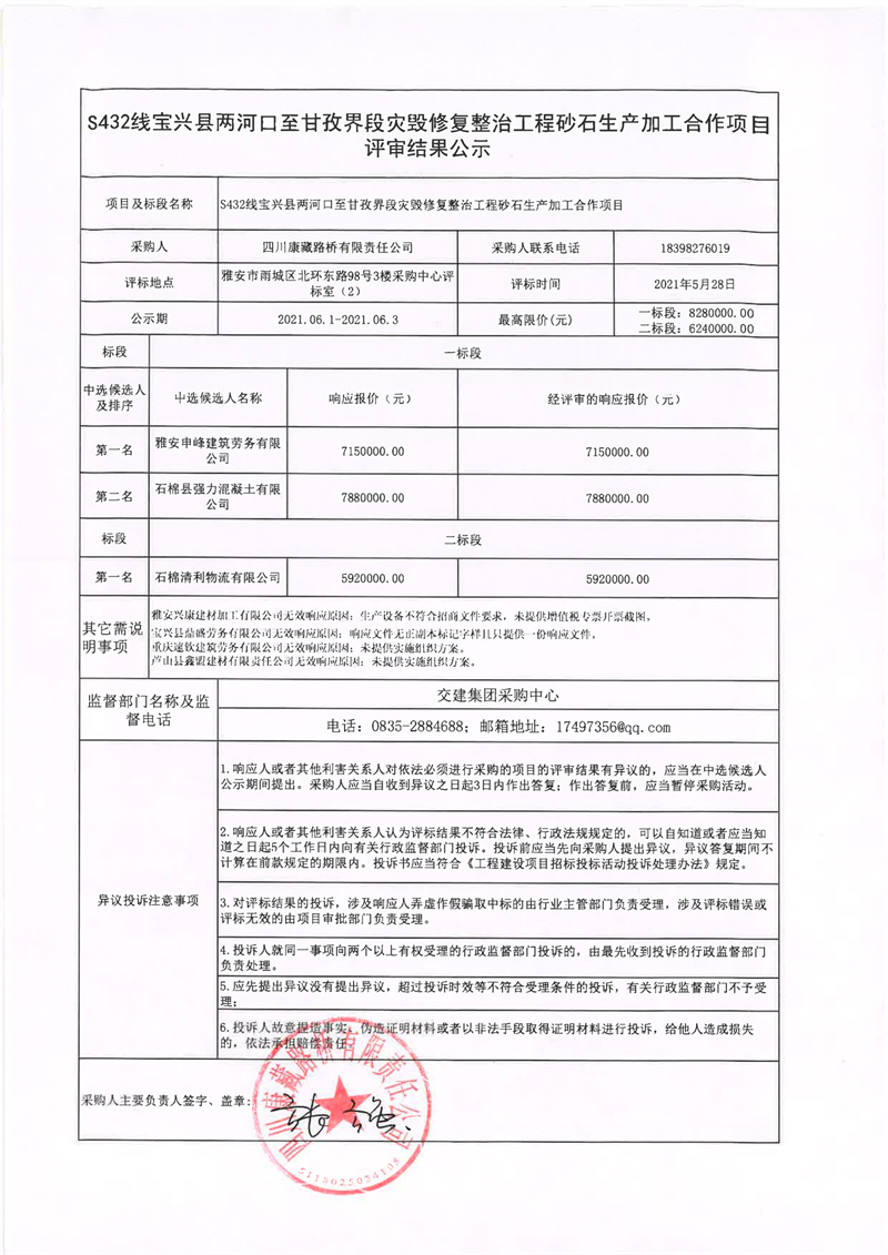 四川康藏路橋有限責任公司S432線寶興縣兩河口至甘孜界段災毀修復整治工程砂石生產加工合作項目評審結果公示