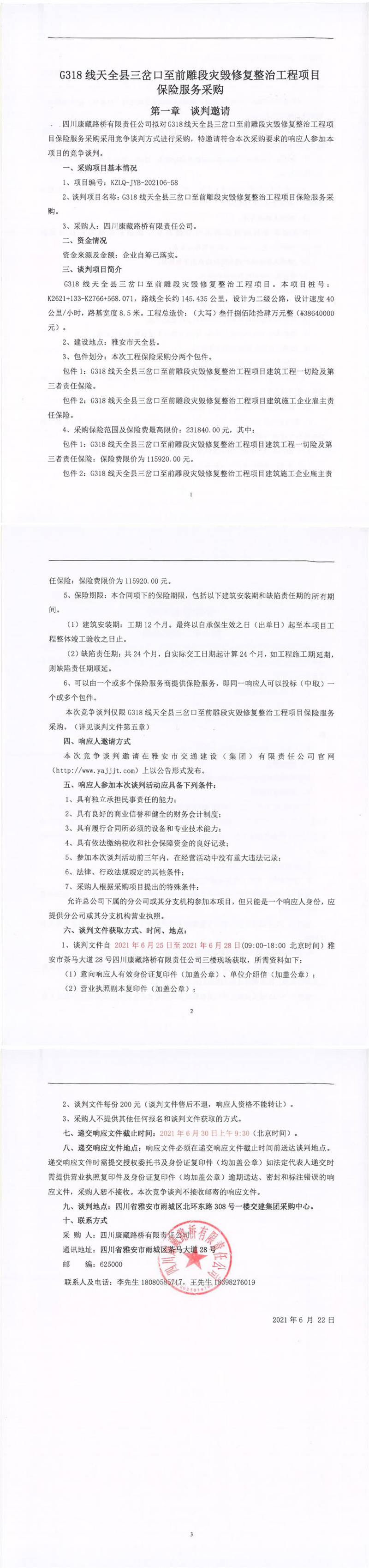 四川康藏路橋有限責任公司G318線天全縣三岔口至前雕段災(zāi)毀修復(fù)整治工程項目保險服務(wù)采購競爭談判公告