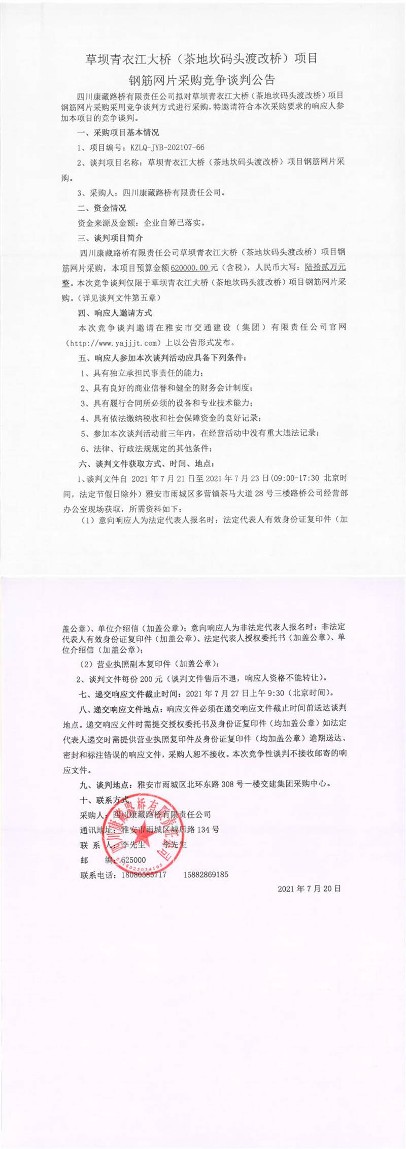 四川康藏路橋有限責(zé)任公司草壩青衣江大橋(茶地坎碼頭渡改橋)項(xiàng)目鋼筋網(wǎng)片采購競爭談判公告