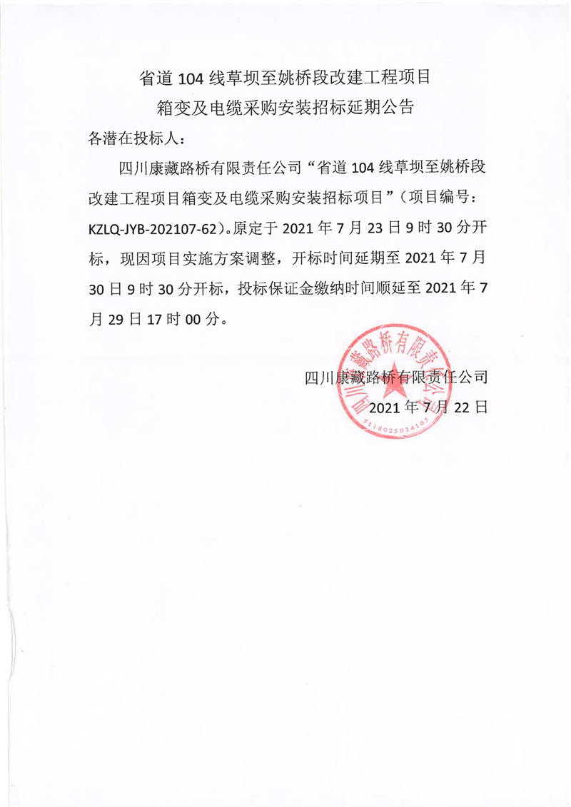 四川康藏路橋有限責(zé)任公司省道104線草壩至姚橋段改建項目箱變及電纜采購安裝招標延期公告