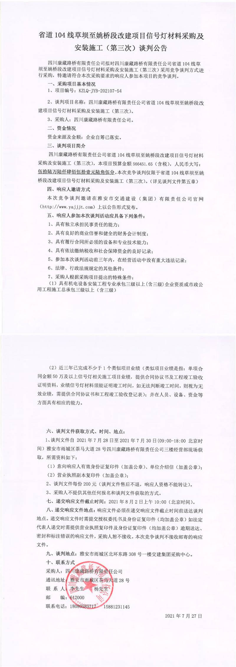 四川康藏路橋有限責任公司省道104線草壩至姚橋段改建項目信號燈材料采購及安裝施工(第三次)談判公告