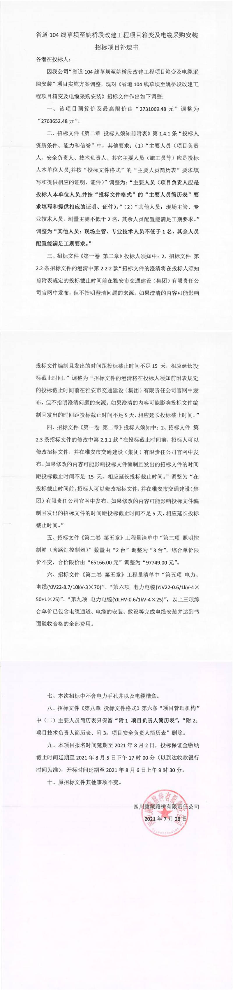 四川康藏路橋有限責(zé)任公司省道104線草壩至姚橋段改建項目箱變及電纜采購安裝招標(biāo)項目補(bǔ)遺書