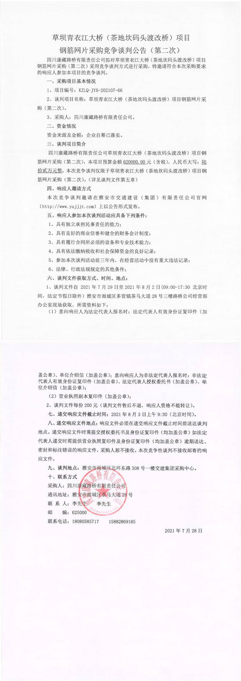 四川康藏路橋有限責任公司草壩青衣江大橋(茶地坎碼頭渡改橋)項目鋼筋網(wǎng)片采購競爭談判公告(第二次)