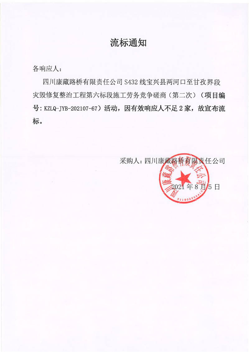 四川康藏路橋有限責任公司S432線寶興縣兩河口至甘孜界段災(zāi)毀修復整治工程第六標段施工勞務(wù)競爭磋商(第二次)流標通知