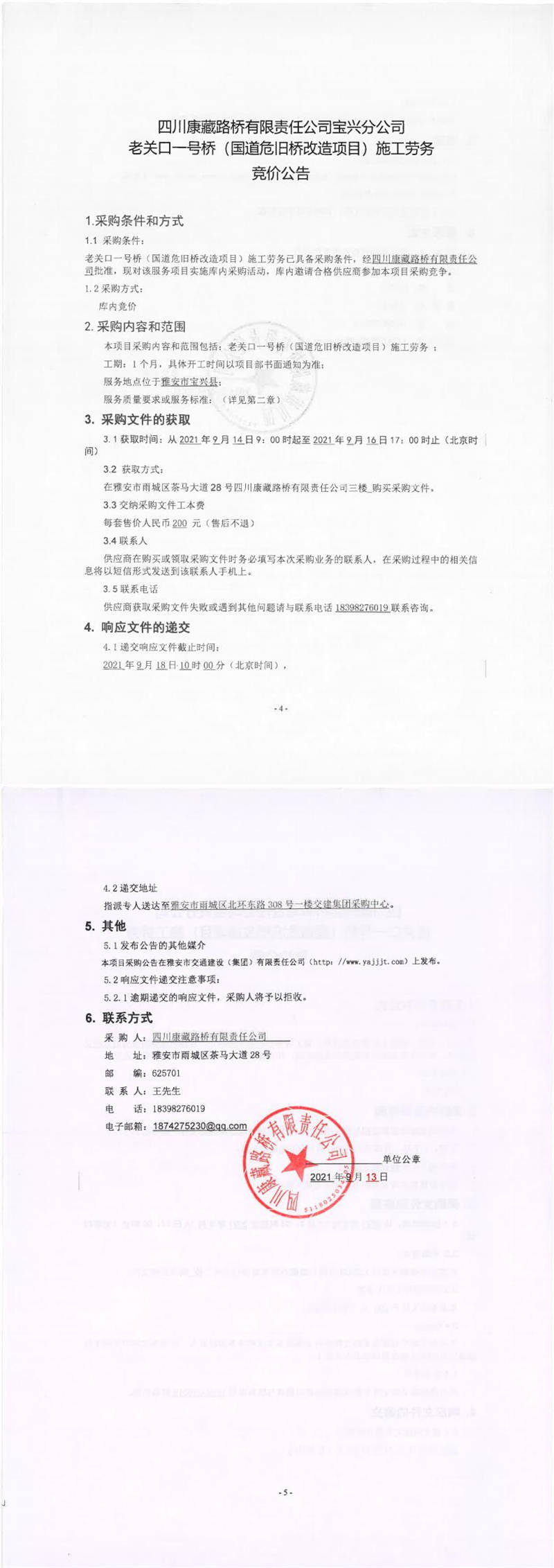 四川康藏路橋有限責(zé)任公司寶興分公司老關(guān)口一號(hào)橋(國道危舊橋改造項(xiàng)目)施工勞務(wù)競價(jià)公告