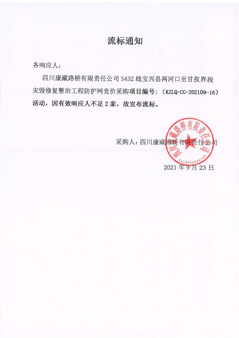 四川康藏路橋有限責(zé)任公司S432線寶興縣兩河口至甘孜界段災(zāi)毀修復(fù)整治工程防護(hù)網(wǎng)采購(gòu)流標(biāo)通知
