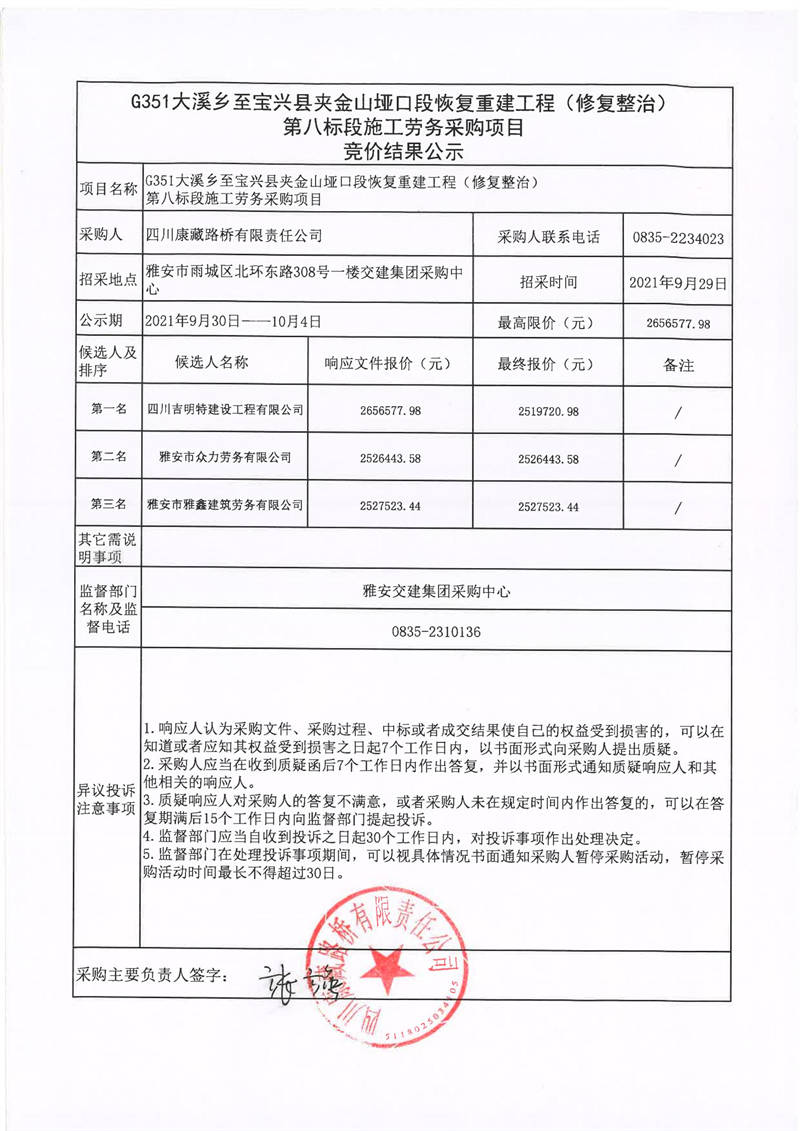 四川康藏路橋有限責任公司G351大溪鄉(xiāng)至寶興縣夾金山埡口段恢復(fù)重建工程(修復(fù)整治)第八標段施工勞務(wù)采購項目競價結(jié)果公示