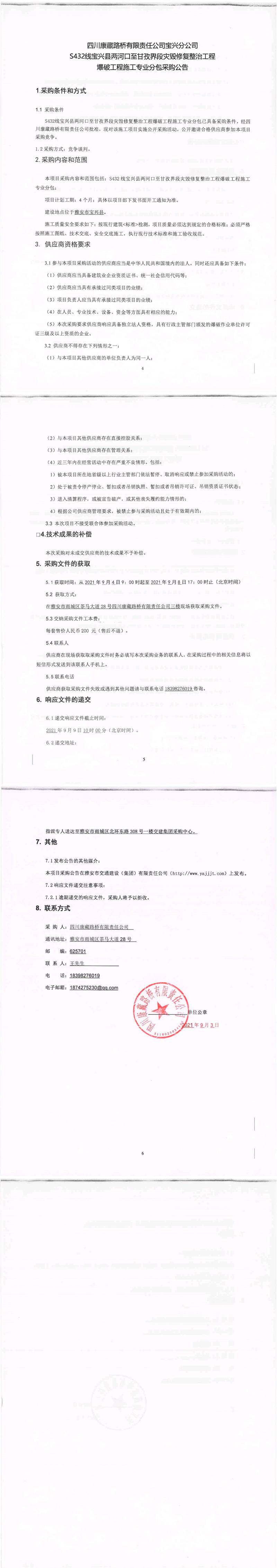 四川康藏路橋有限責(zé)任公司寶興分公司s432線寶興縣兩河口至甘孜界段災(zāi)毀修復(fù)整治工程爆破工程施工專業(yè)分包采購公告