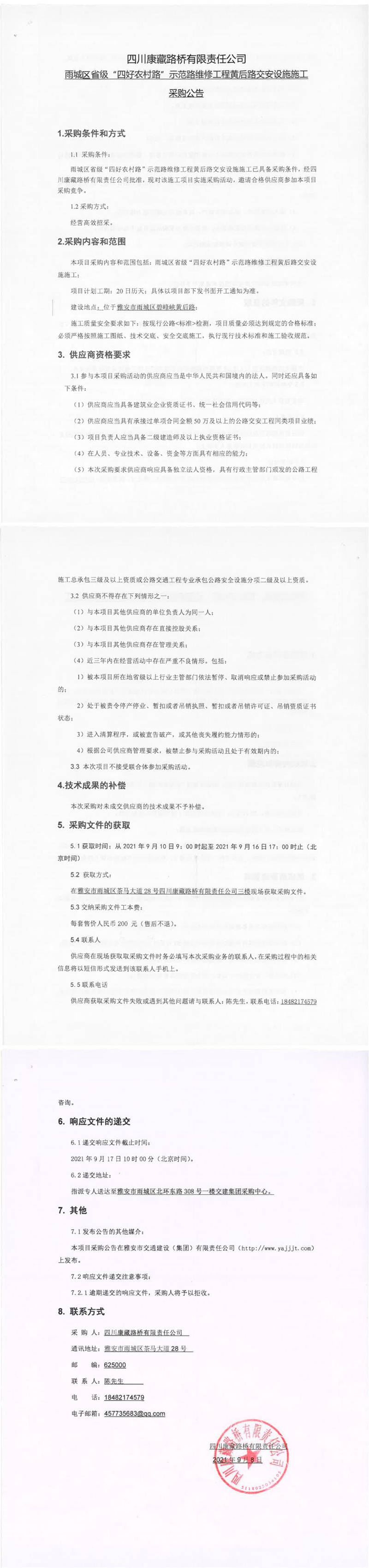 四川康藏路橋有限責任公司雨城區(qū)省級“四好農(nóng)村路”示范路維修工程黃后路交安設施施工采購公告