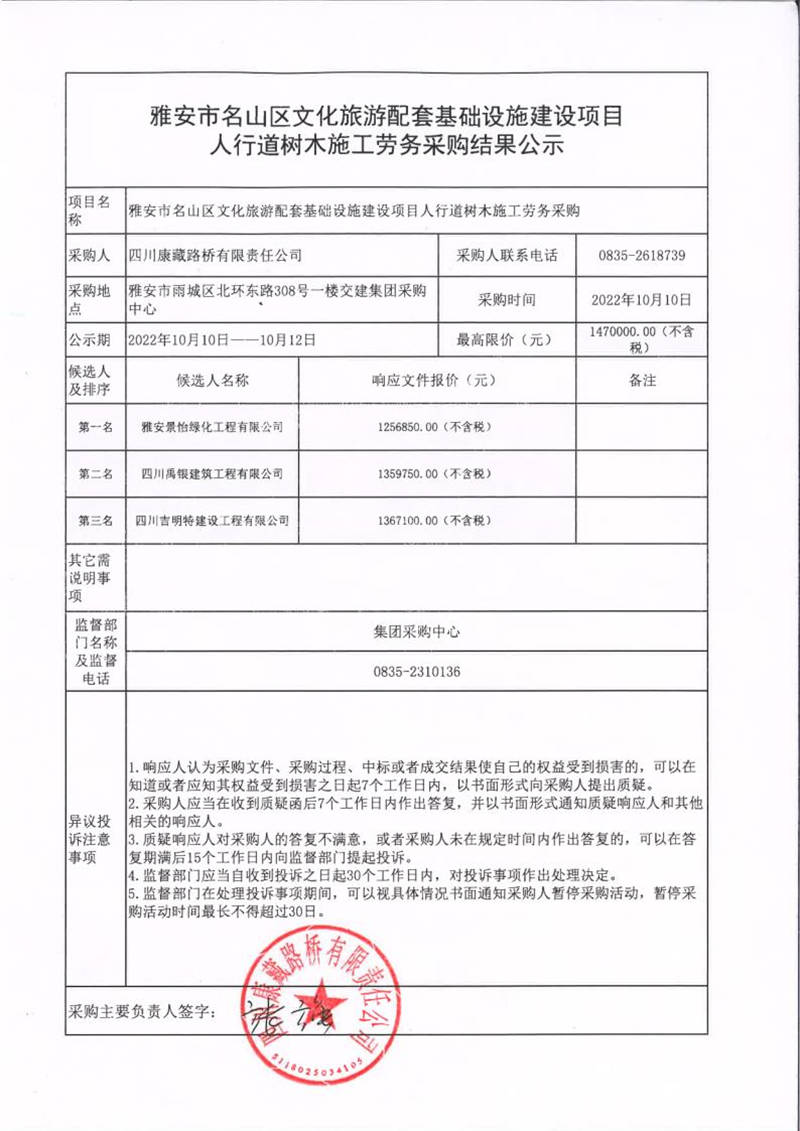四川康藏路橋有限責任公司雅安市名山區(qū)文化旅游配套基礎設施建設項目人行道樹木施工勞務采購結果公示