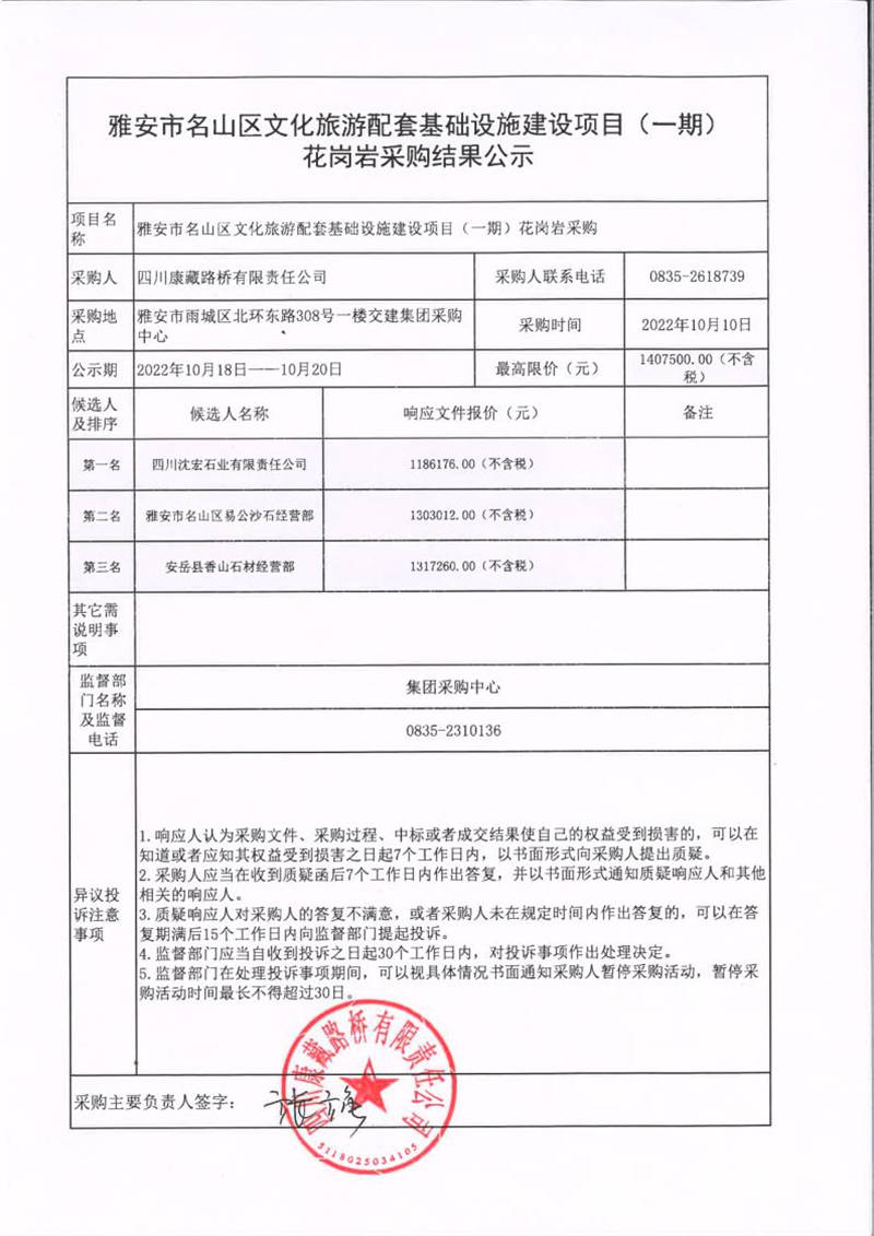 四川康藏路橋有限責(zé)任公司雅安市名山區(qū)文化旅游配套基礎(chǔ)設(shè)施建設(shè)項目(一期)花崗巖采購結(jié)果公示