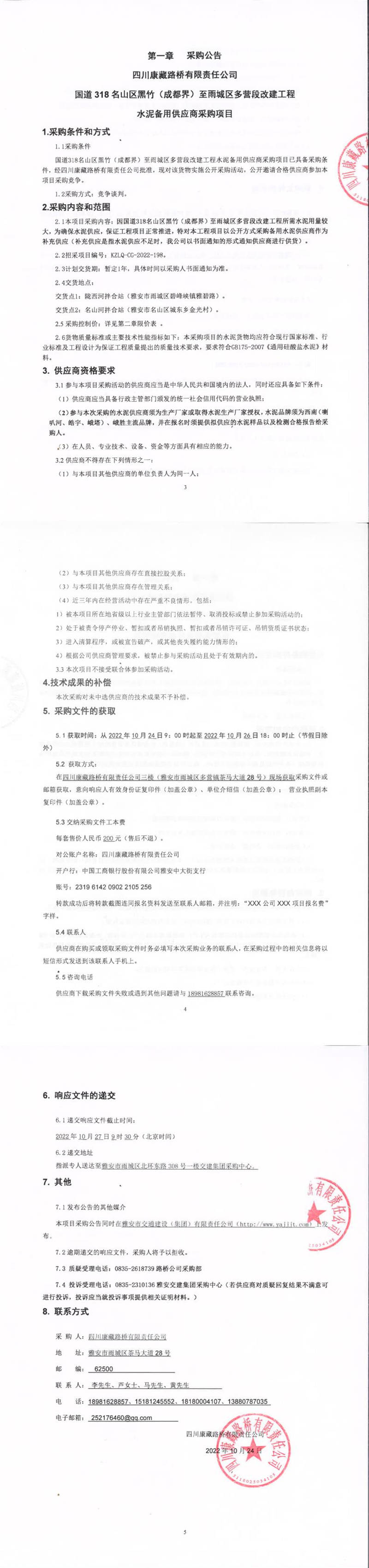 四川康藏路橋有限責(zé)任公司國(guó)道318名山區(qū)黑竹(成都界)至雨城區(qū)多營(yíng)段改建工程水泥備用供應(yīng)商采購(gòu)項(xiàng)目補(bǔ)遺書(shū)(一)