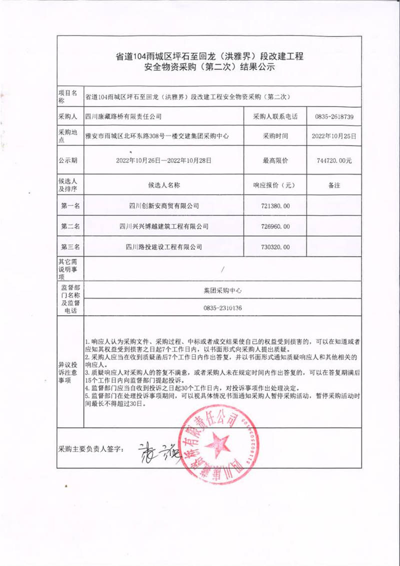 四川康藏路橋有限責(zé)任公司省道104雨城區(qū)坪石至回龍(洪雅界)段改建工程安全物資采購(gòu)(第二次)結(jié)果公示