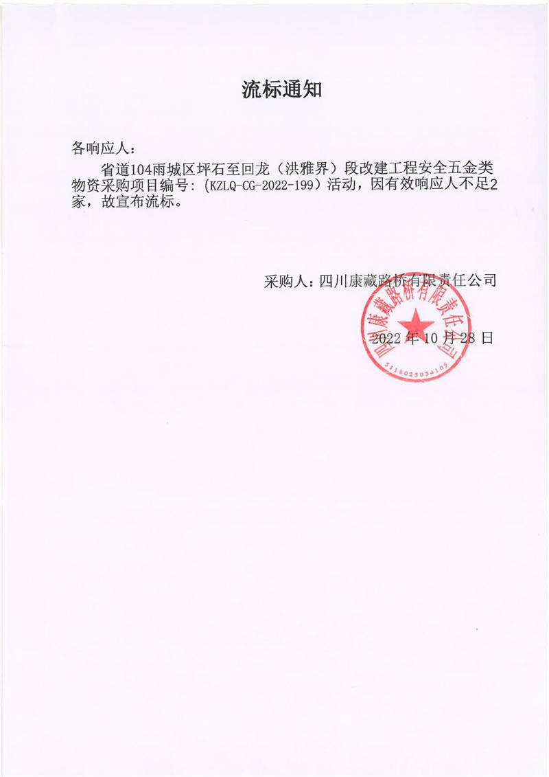 四川康藏路橋有限責(zé)任公司省道104雨城區(qū)坪石至回龍(洪雅界)段改建工程安全五金類物資采購項目流標(biāo)通知