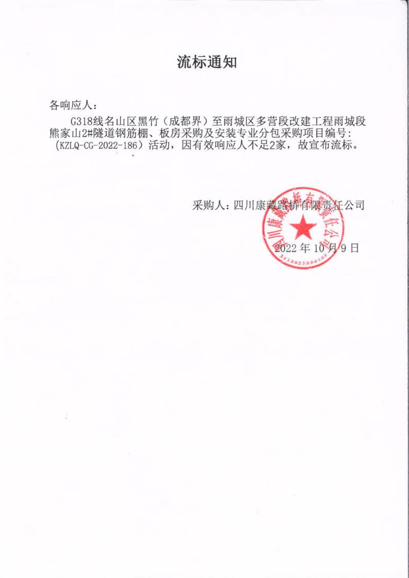 四川康藏路橋有限責(zé)任公司G318線名山區(qū)黑竹(成都界)至雨城區(qū)多營段改建工程雨城段熊家山2#隧道鋼筋棚、板房采購及安裝專業(yè)分包采購項目流標(biāo)通知