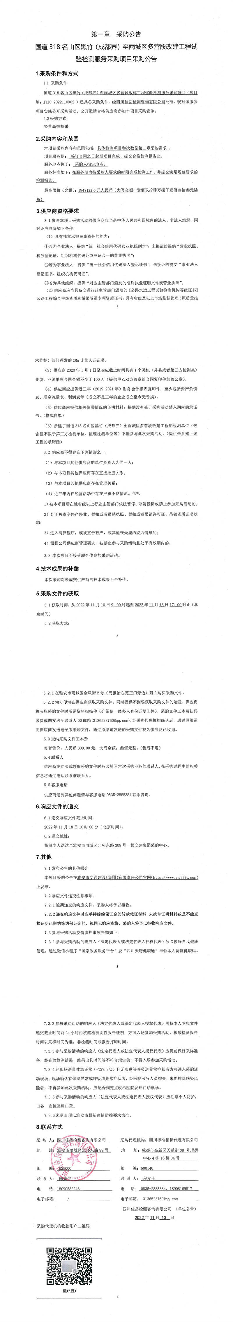 四川佳岳檢測咨詢有限公司國道318名山區(qū)黑竹(成都界)至雨城區(qū)多營段改建工程試驗檢測服務(wù)采購項目采購公告
