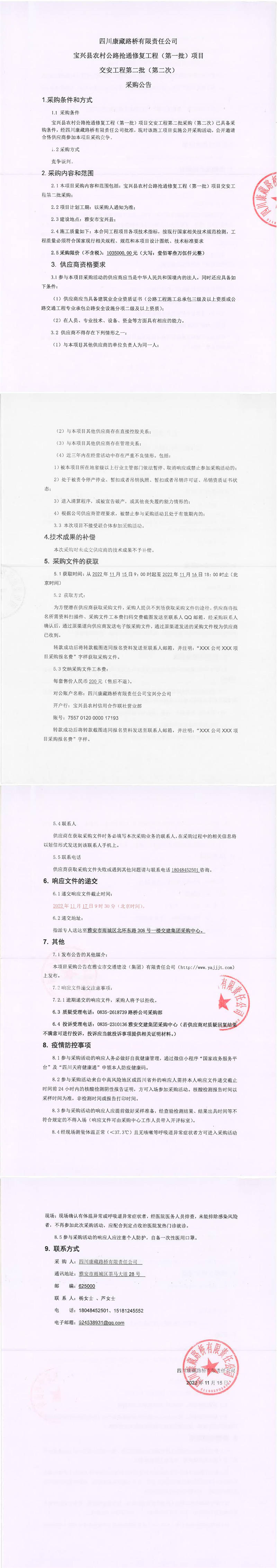 四川康藏路橋有限責(zé)任公司寶興縣農(nóng)村公路搶通修復(fù)工程(第一批)項目交安工程第二批采購(第二次)結(jié)果公示
