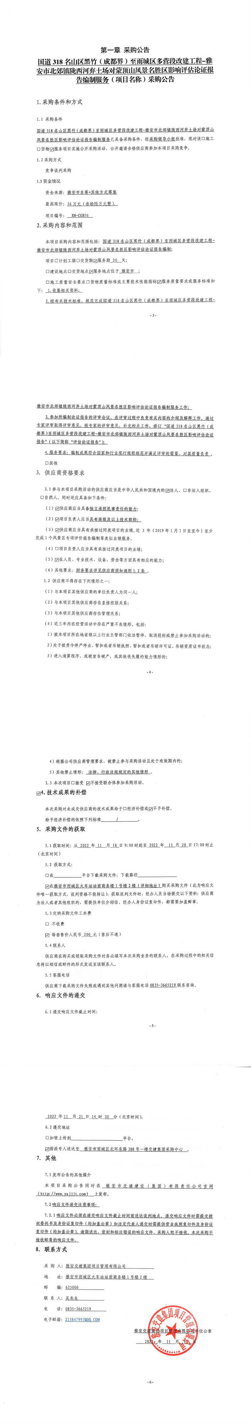 雅安交建集團項目管理有限公司國道318名山區(qū)黑竹(成都界)至雨城區(qū)多營段改建工程-雅安市北郊鎮(zhèn)隴西河棄土場對蒙頂山風(fēng)景名勝區(qū)影響評估論證報告編制服務(wù)采購公告