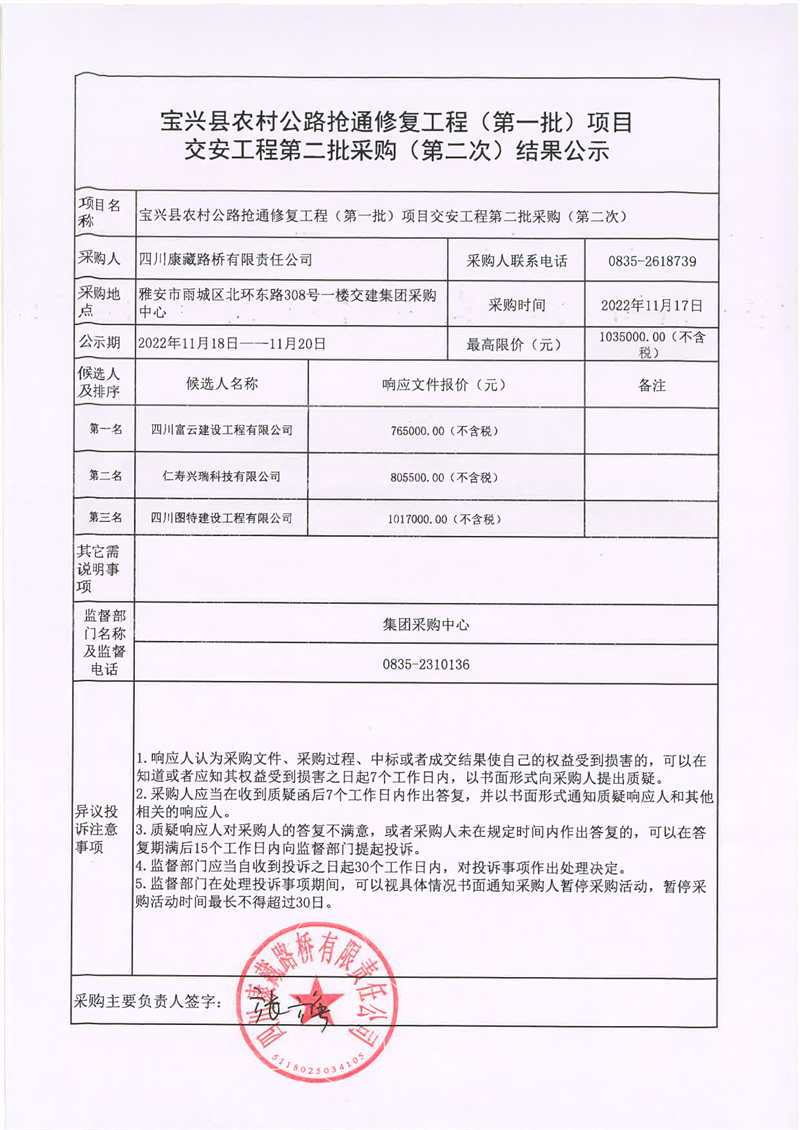 四川康藏路橋有限責(zé)任公司寶興縣農(nóng)村公路搶通修復(fù)工程(第一批)項目交安工程第二批采購(第二次)結(jié)果公示