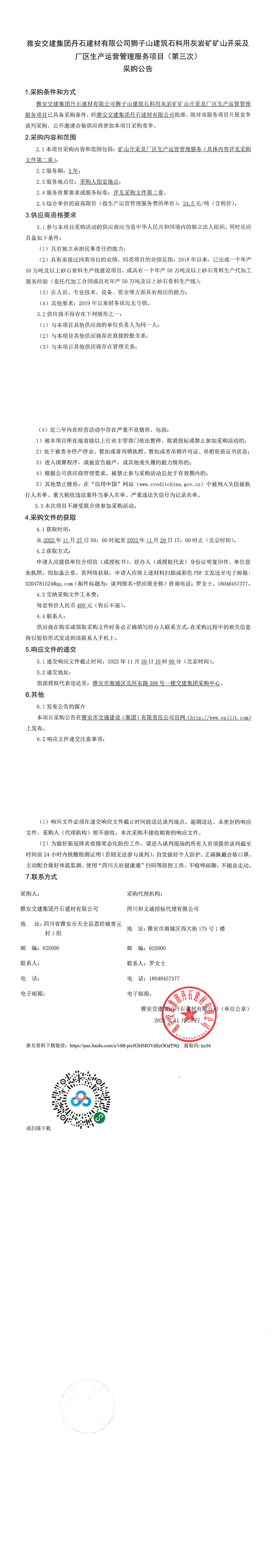 雅安交建集團(tuán)丹石建材有限公司獅子山建筑石料用灰?guī)r礦礦山開采及廠區(qū)生產(chǎn)運營管理服務(wù)項目(第三次)采購公告