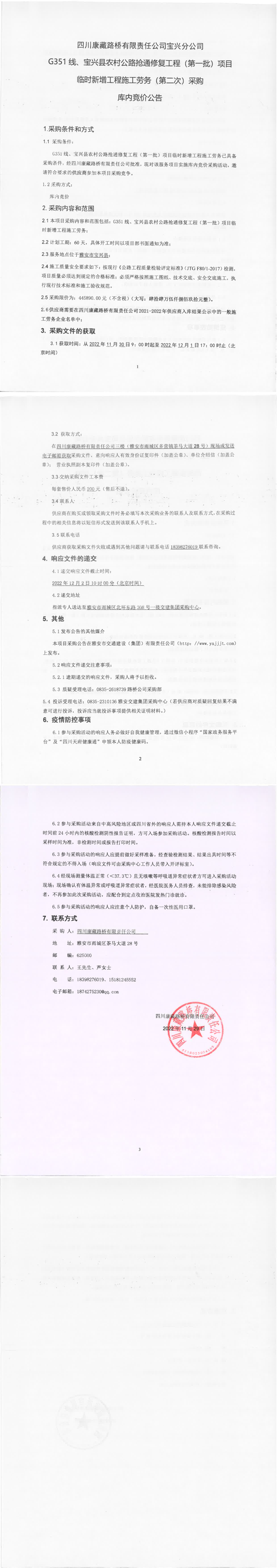四川康藏路橋有限責(zé)任公司G351線、寶興縣農(nóng)村公路搶通修復(fù)工程(第一批)項(xiàng)目臨時(shí)新增工程施工勞務(wù)(第二次)采購庫內(nèi)競價(jià)公告