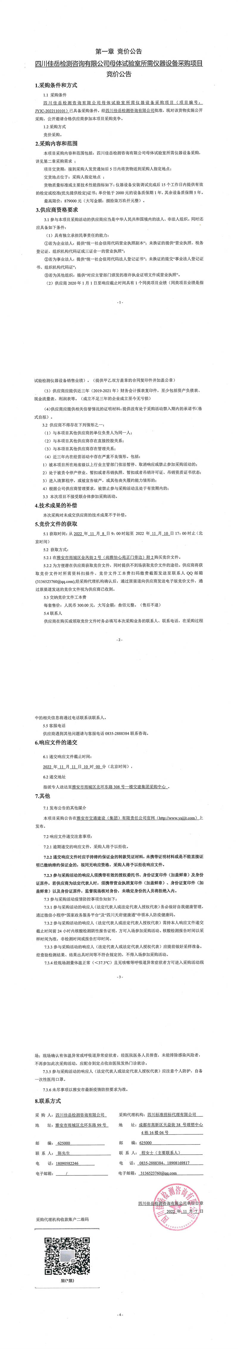 四川佳岳檢測咨詢有限公司母體試驗(yàn)室所需儀器設(shè)備采購項(xiàng)目采購公告