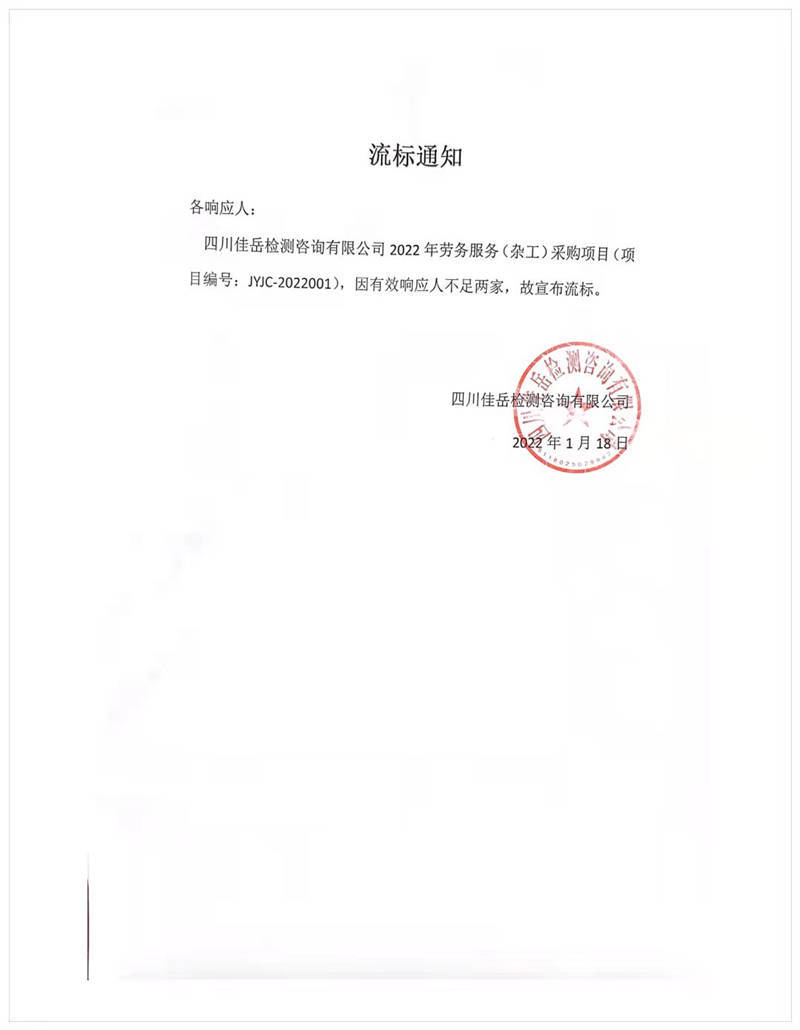 四川佳岳檢測(cè)咨詢(xún)有限公司2022年勞務(wù)服務(wù)(雜工)采購(gòu)項(xiàng)目流標(biāo)通知