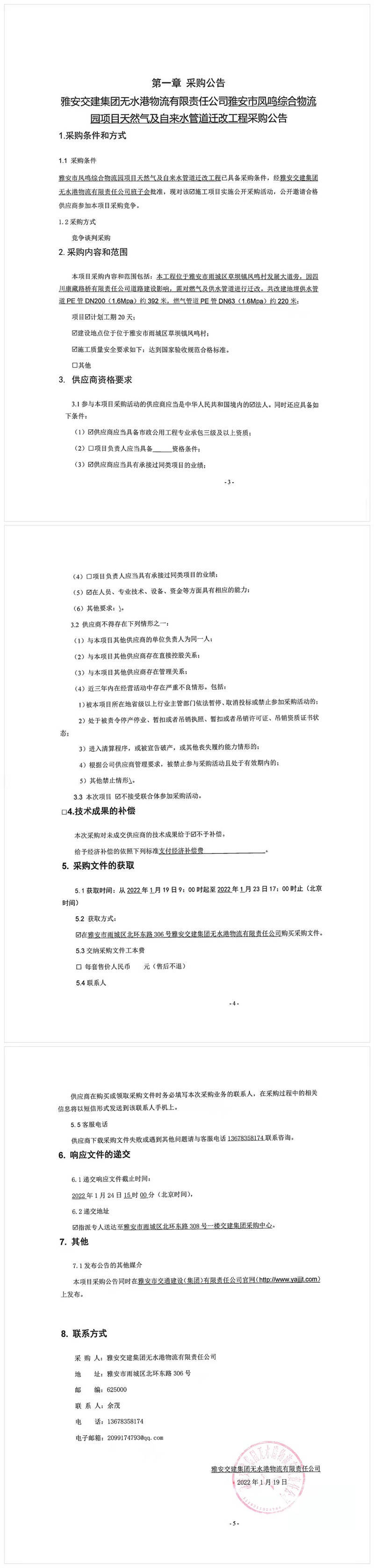 雅安交建集團(tuán)無水港物流有限責(zé)任公司雅安市鳳鳴綜合物流園項目天然氣及自來水管道遷改工程采購公告