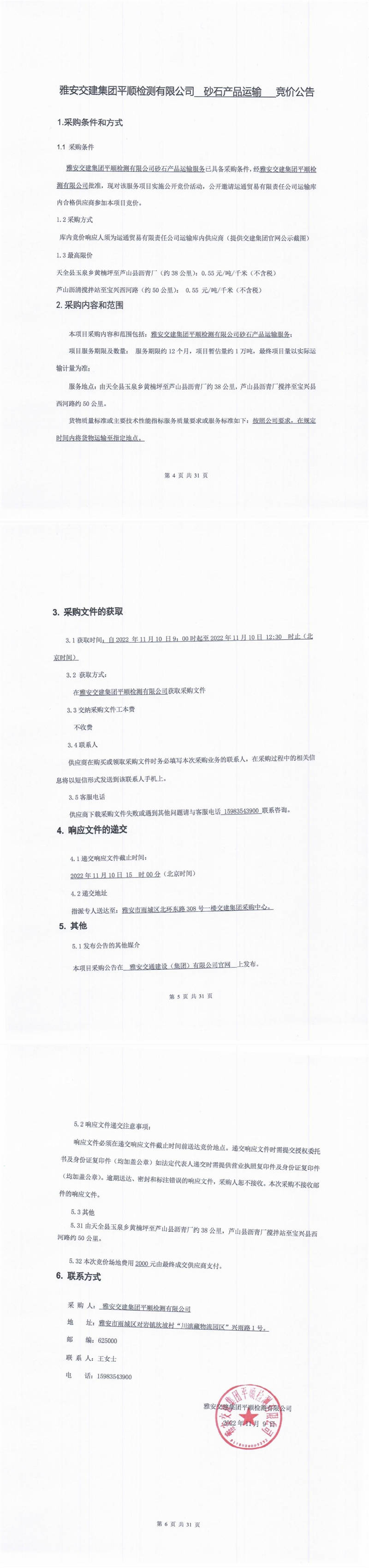 雅安交建集團(tuán)平順檢測(cè)有限公司砂石產(chǎn)品運(yùn)輸競(jìng)價(jià)公告