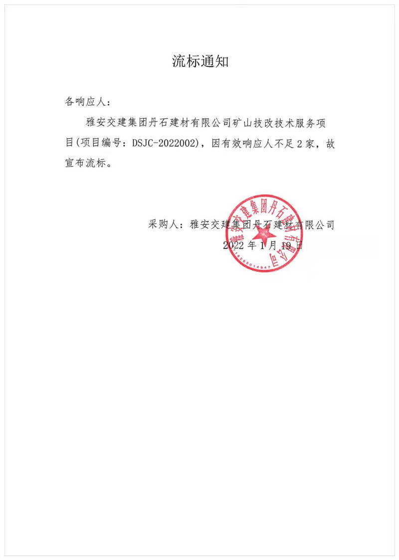 雅安交建集團丹石建材有限公司礦山技改技術(shù)服務項目流標通知