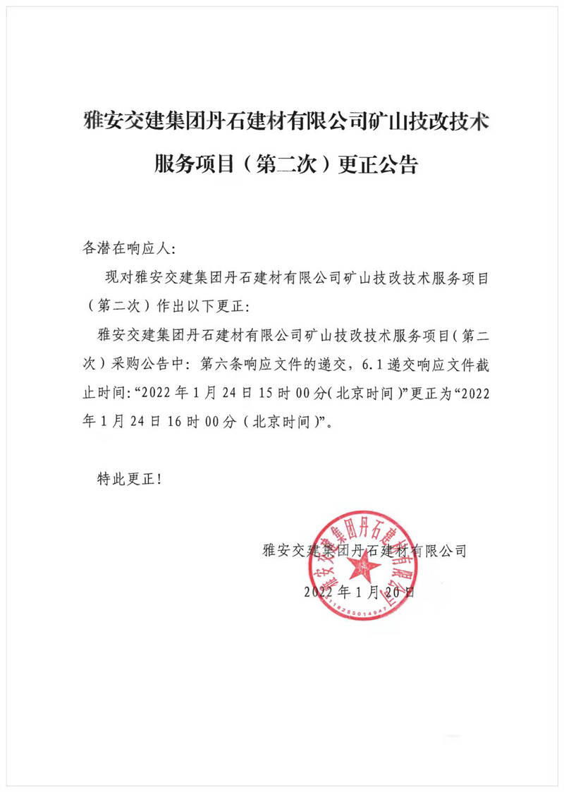 雅安交建集團(tuán)丹石建材有限公司礦山技改技術(shù)服務(wù)項(xiàng)目(第二次)更正公告