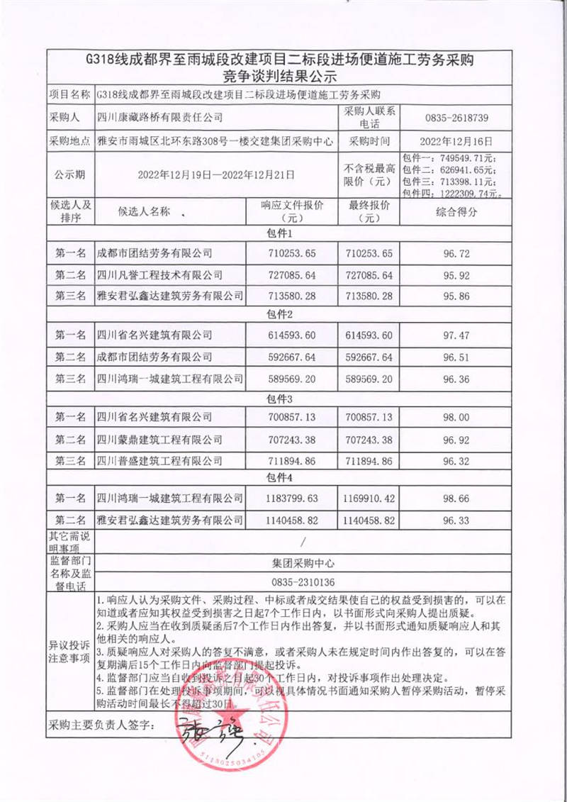 四川康藏路橋有限責任公司G318線成都界至雨城段改建項目二標段進場便道施工勞務采購競爭談判結(jié)果公示