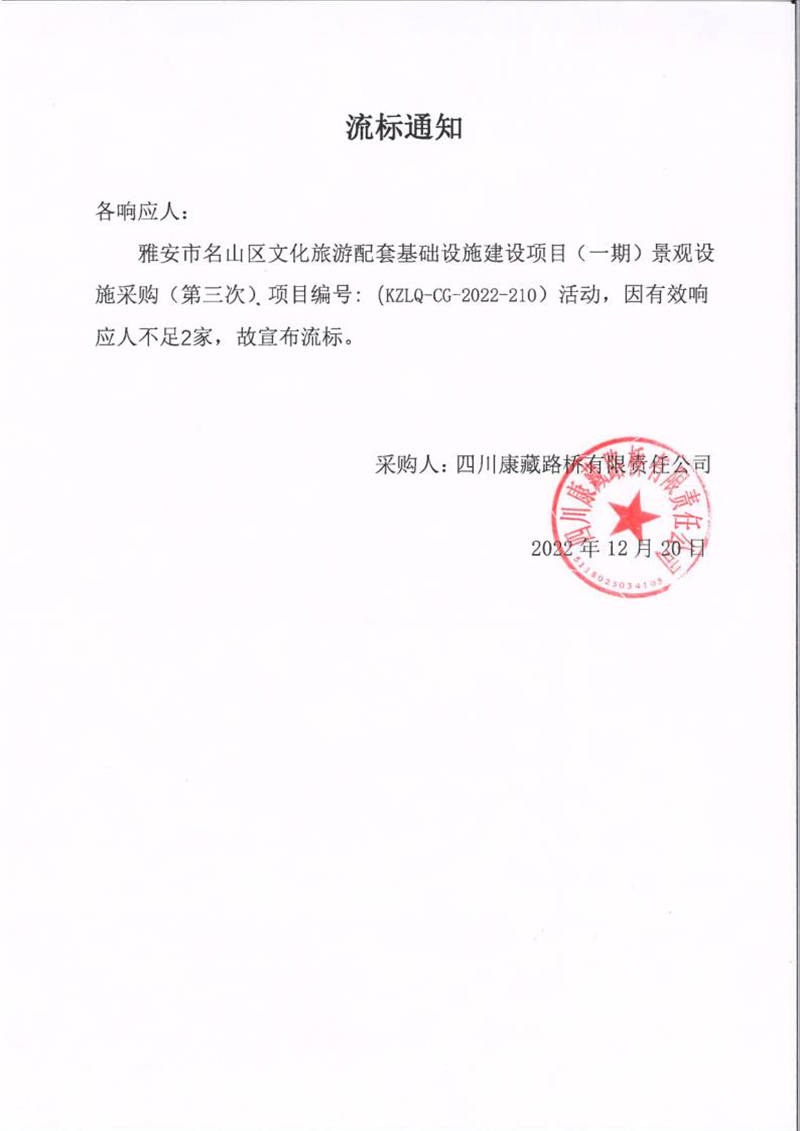 四川康藏路橋有限責任公司雅安市名山區(qū)文化旅游配套基礎(chǔ)設施建設項目(一期)景觀設施采購(第三次)流標通知