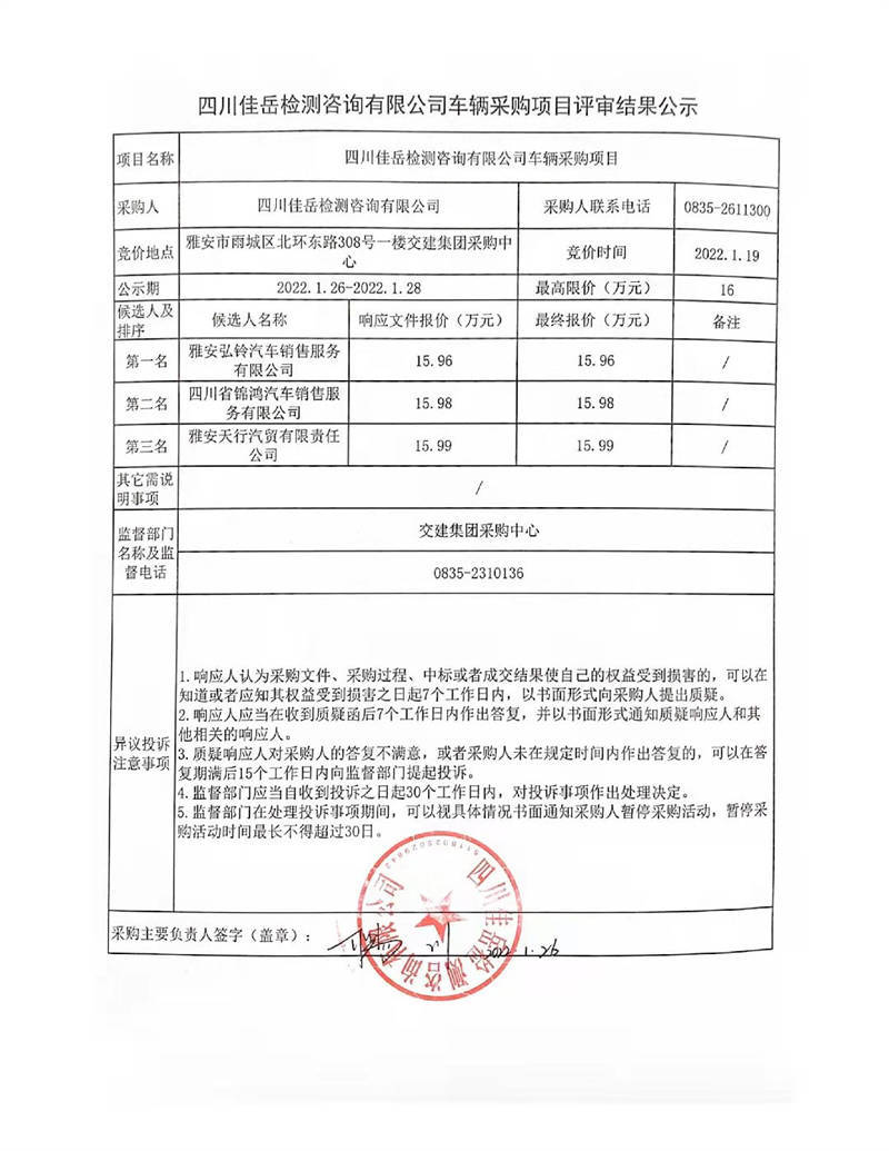四川佳岳檢測咨詢有限公司車輛采購項(xiàng)目評(píng)審結(jié)果公示